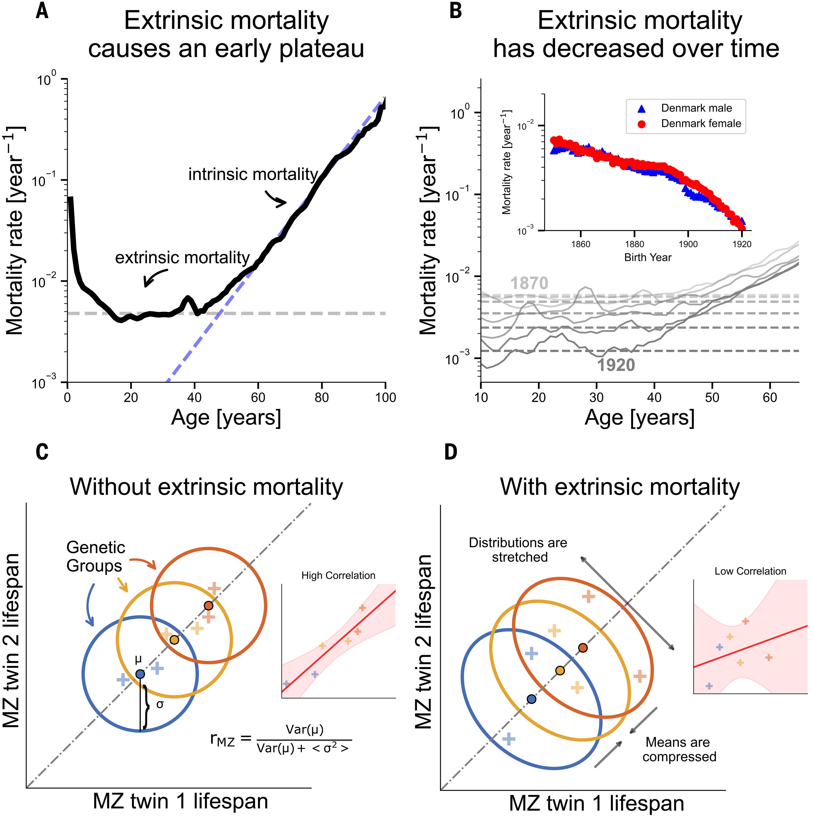 Many previous studies found a rather low heritability for lifespan (about 20-25%). But it turns out that this is because they examined cohorts who were born from 1870-1920, when non-genetic variance of lifespan was much higher than it is today. This study (Shenhar et al. 2026) examined three cohorts of Scandinavian twins and one cohort of American centenarian-sibling pairs, and analyzed extrinsic (accident, homicide, infectious disease) vs intrinsic mortality.